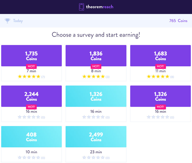 TheoremReach: Some surveys are marked as “HOT!” (often shown in darker purple) and tend to have higher qualification rates.