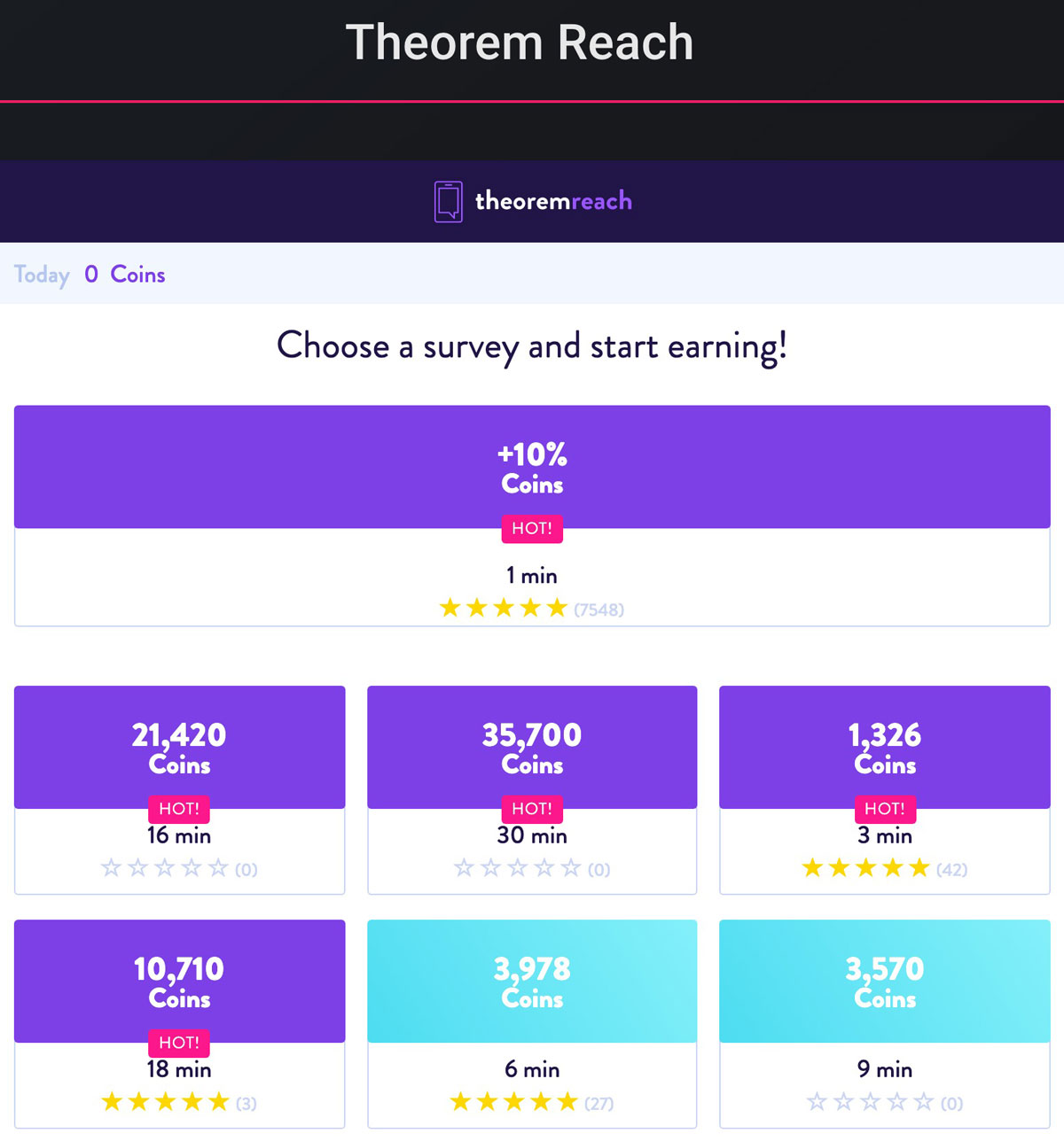 Below is an example of TheoremReach, one of our most popular survey offerwalls.